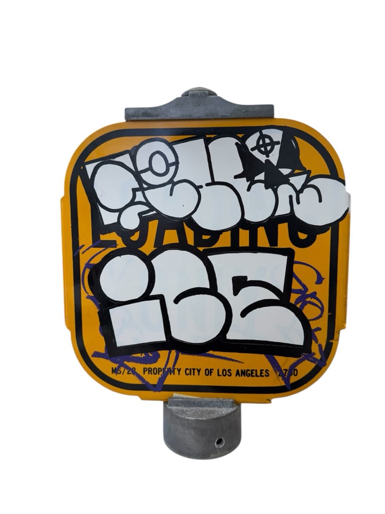 1/1 LOADING ZONE metal sign, real reflective yellow street sign tagged with LITER and ICE throw-ups. Hand-painted in Los Angeles. One-of-one piece on solid metal, no repeats, no extras.
